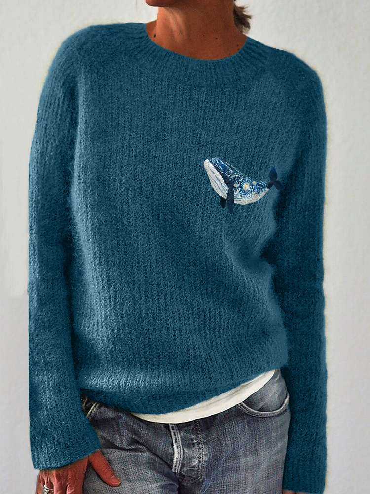Starry Night Inspired Whale Embroidery Art Cozy Sweater