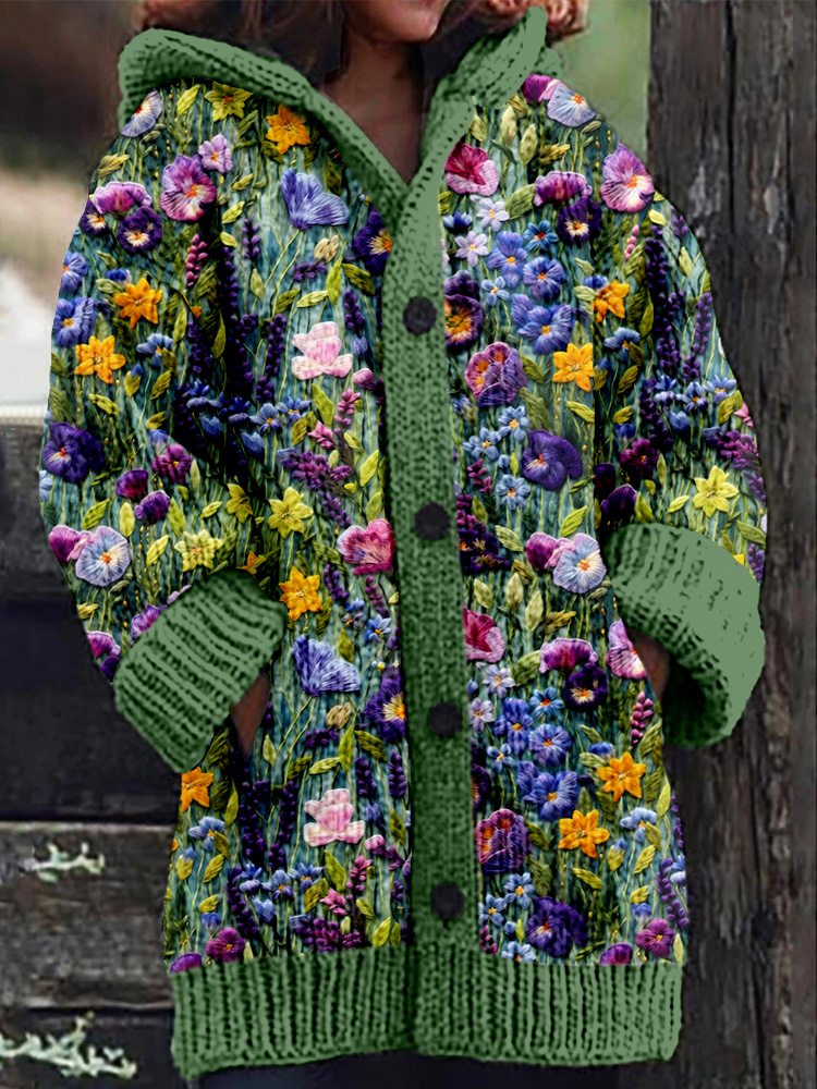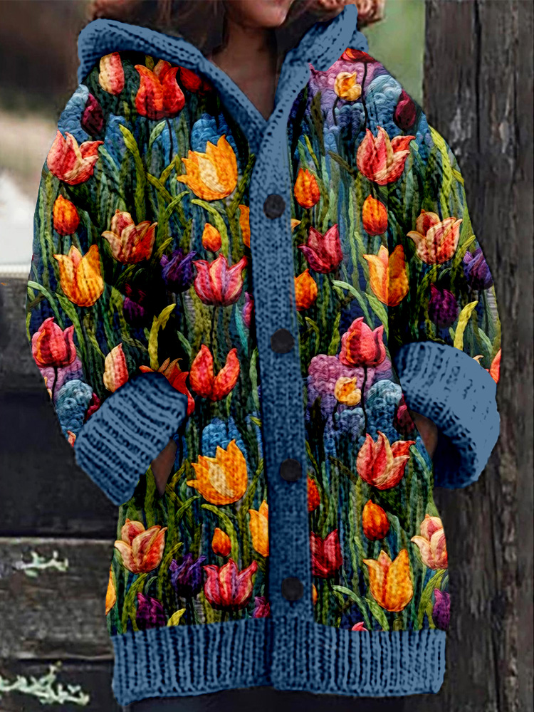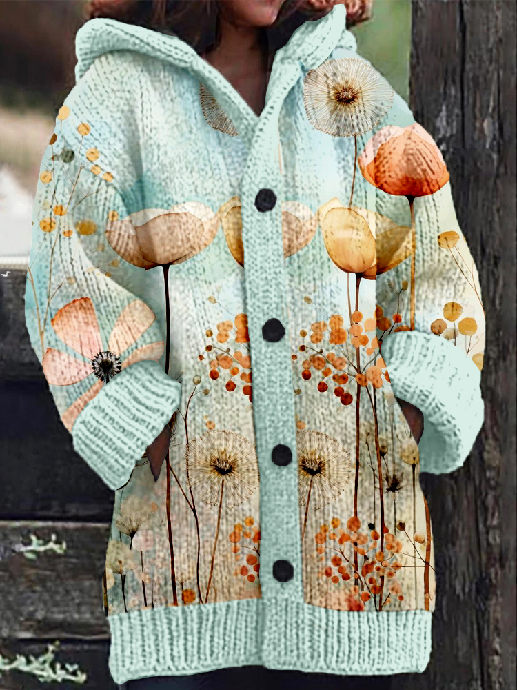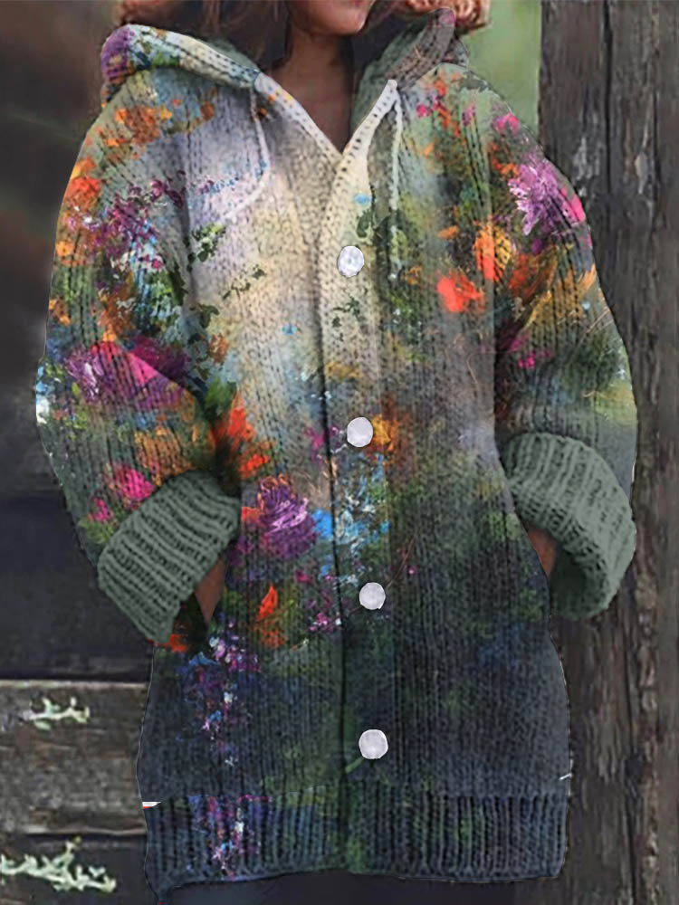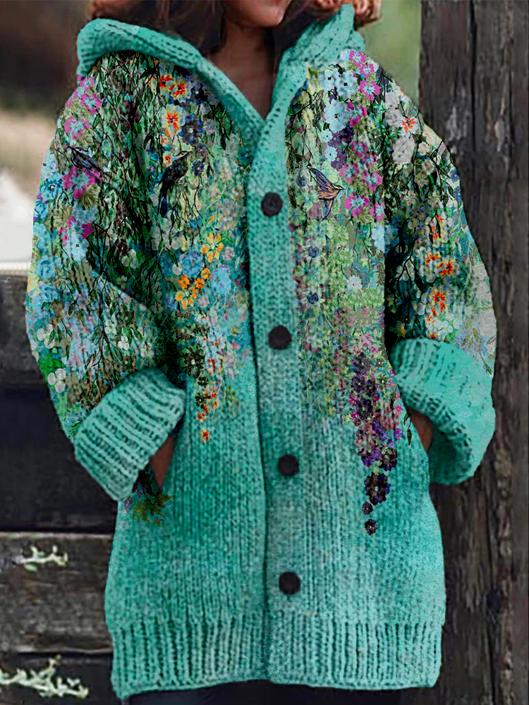 Women Vintage Floral Art Cozy Knit Button Hooded Cardigan