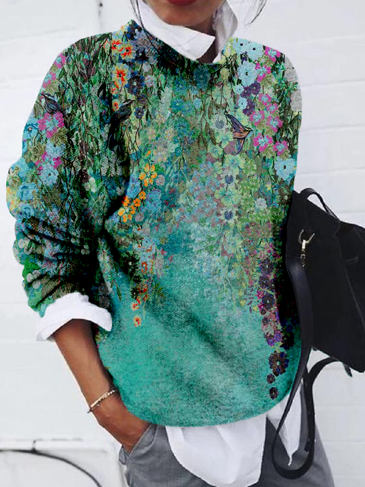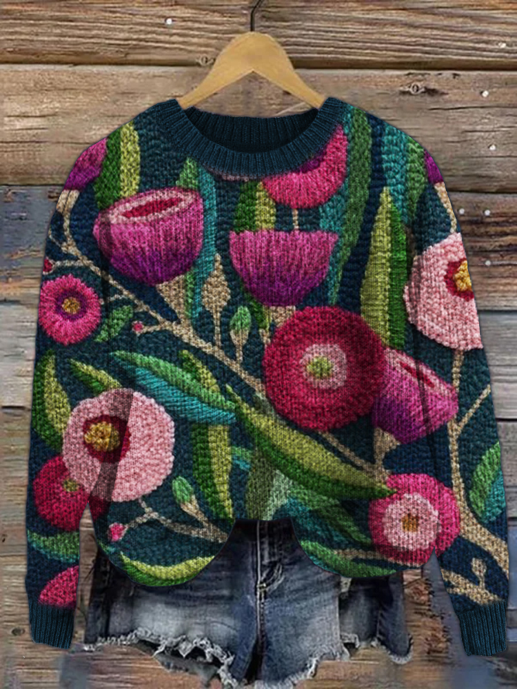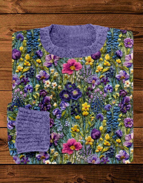 Elegant Violet Wildflower Embroidery Art Cozy Knit Sweater