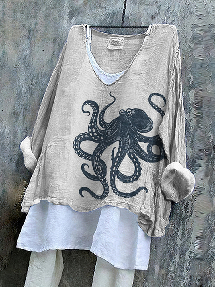 Vintage Japanese Art Octopus V Neck Linen Blend Shirt