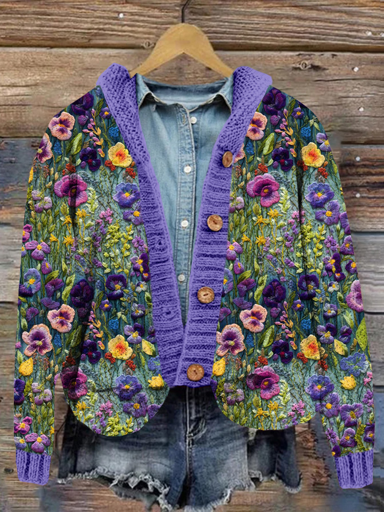 Violet Wildflower Embroidery Art Cozy Hooded Knit Cardigan